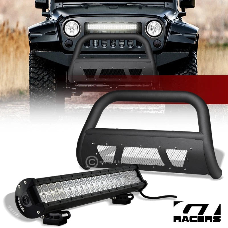 For 10-18 Wrangler Jk Matte Black Studded Mesh Bull Bar+120W CREE LED Fog