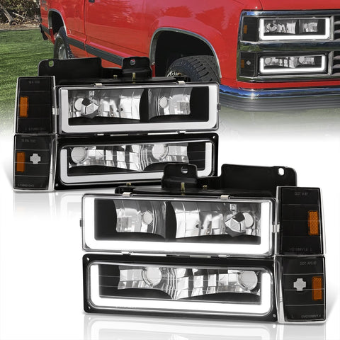 Chevrolet C/K 1500 2500 3500 1994-1998 LED DRL Bar Factory Style Headlights + Bumpers + Corners Black Housing Clear Len Clear Reflector