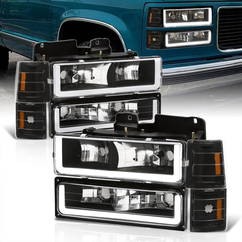 Chevrolet C/K 1500 2500 3500 1994-1998 LED DRL Bar Factory Style Headlights + Bumpers + Corners Black Housing Clear Len Amber Reflector