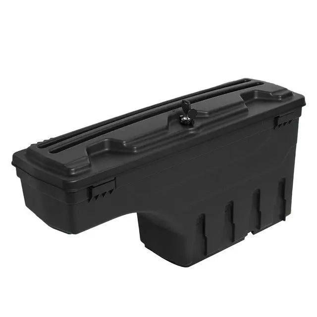 Secure, transport, and access your belongings in your truck bed easily. This wheel well box is made out of heavy duty abs plastic and is locked and weather sealed. The mount has a eyelet to install a lock to secure to the bed and the box can swivel out for easy access with the pull of the bottom handle.