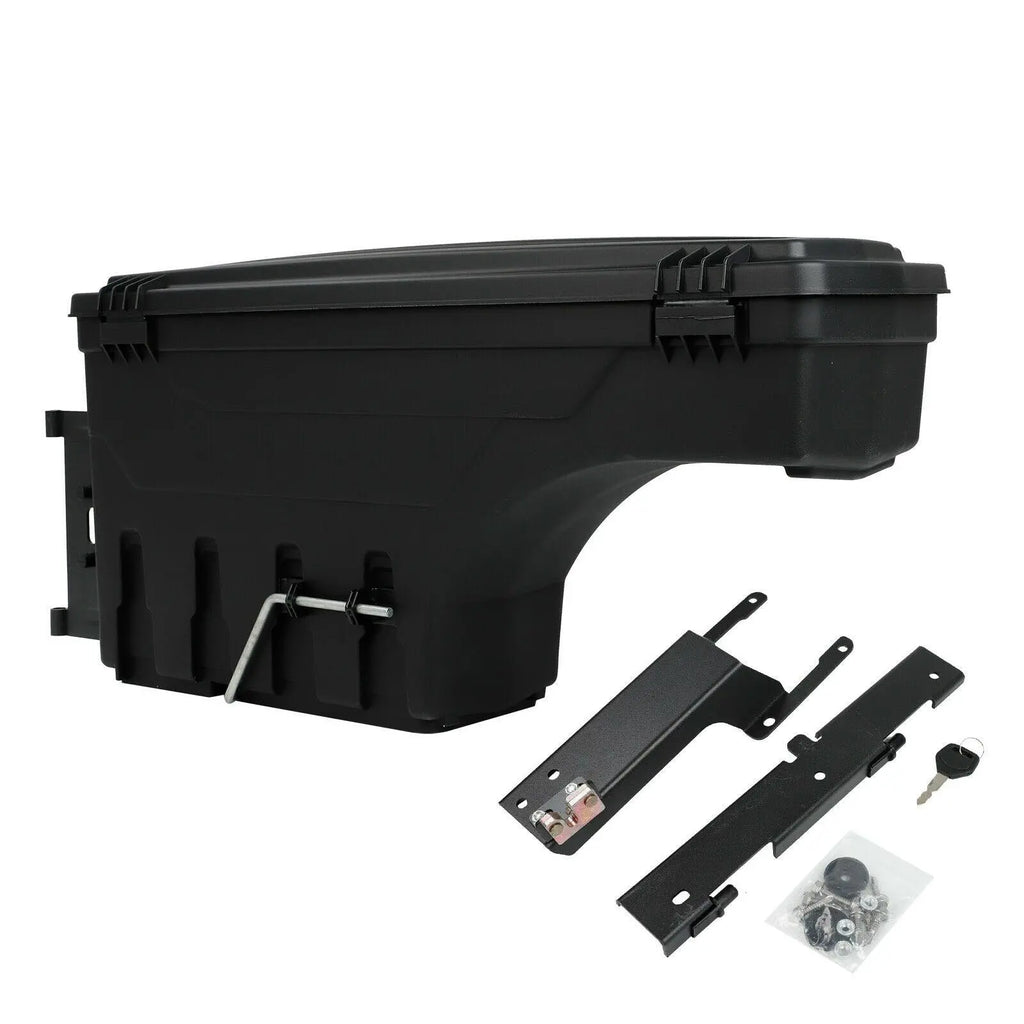 ULTIMATE ACCESSIBILITY - This toolbox swings out nearly 180° towards you for easy access from the tailgate & swings back into a locking position over the wheel well for maximum bed access