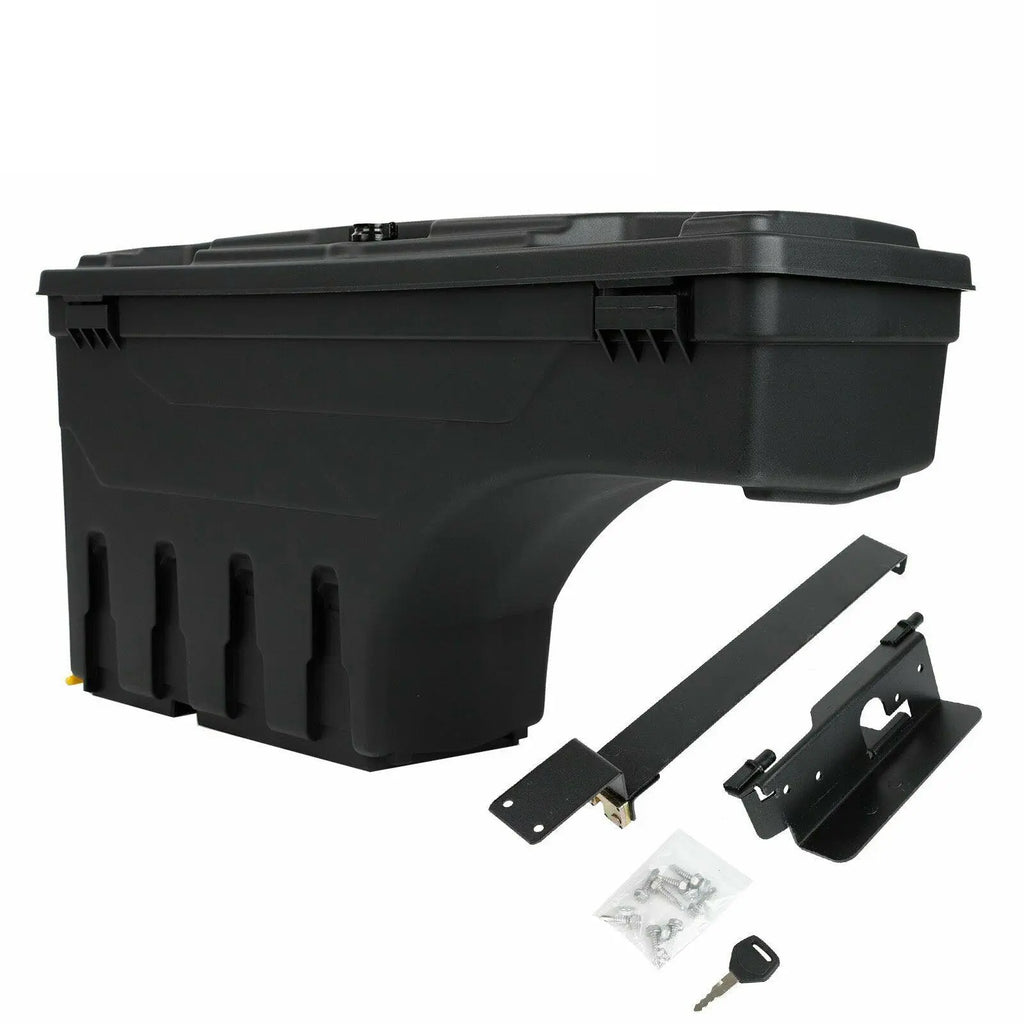 ULTIMATE ACCESSIBILITY - This toolbox swings out nearly 180° towards you for easy access from the tailgate & swings back into a locking position over the wheel well for maximum bed access