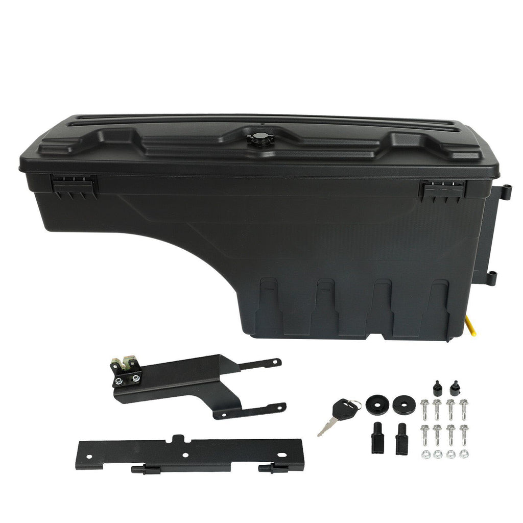 ULTIMATE ACCESSIBILITY - This toolbox swings out nearly 180° towards you for easy access from the tailgate & swings back into a locking position over the wheel well for maximum bed access